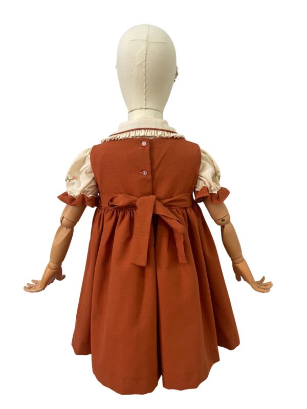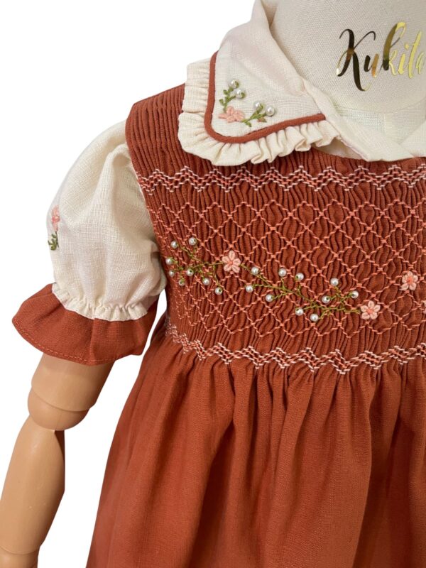 Nos llena de alegría presentarte Aurora, un vestido que inaugura una nueva etapa en nuestras creaciones. Esta pieza está confeccionada en un cálido tono terracota que evoca nostalgia y elegancia, acompañado de una blusa crema que resalta la suavidad y delicadeza del conjunto. Cada detalle desde el bordado smock con perlitas hasta las diminutas flores en el cuello y mangas está realizado completamente a mano, un trabajo de amor que se refleja en cada puntada.