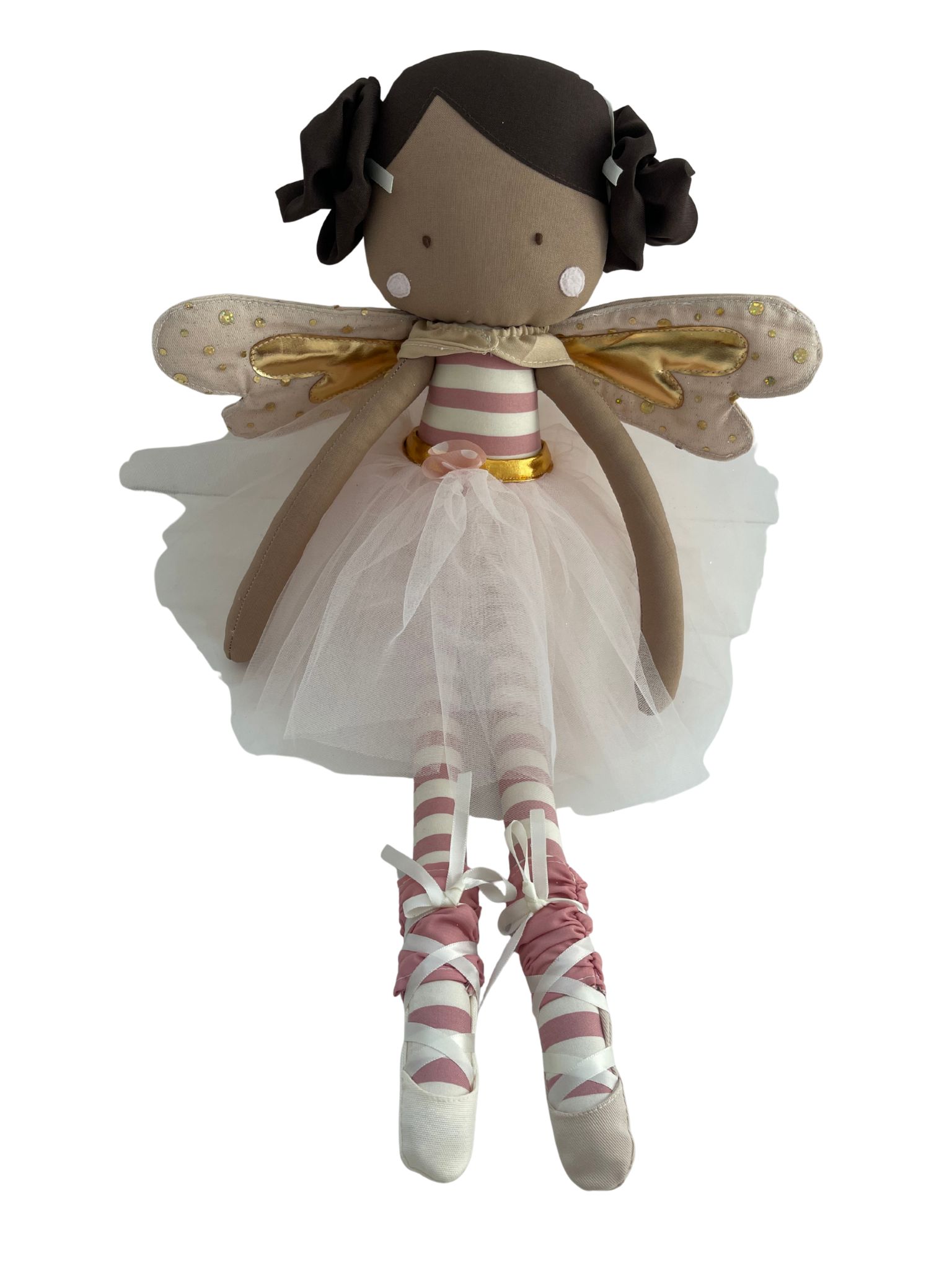 Su diseño destaca por sus orejas largas y caídas, que le aportan una expresión tierna y serena. Viste un delicado vestidito de tela suave, acompañado de zapatillas, cuidando cada detalle para mantener una estética clásica y atemporal.