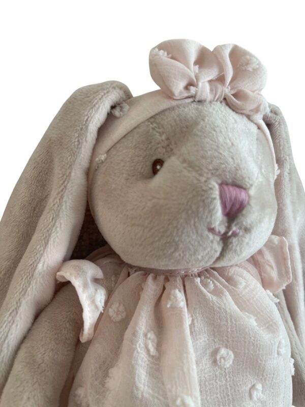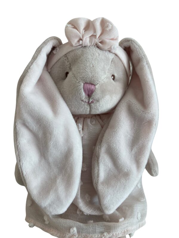 La Coneja Orejas está elaborada en tela extra suave sueca, con orejitas largas y caídas, vestido delicado y zapatillas a juego. Ideal para acompañar momentos de descanso, juego y cariño.