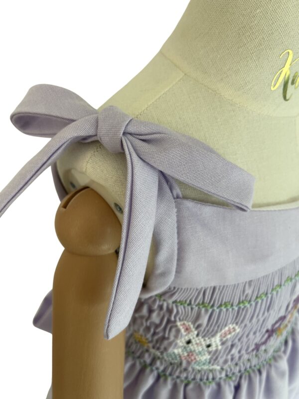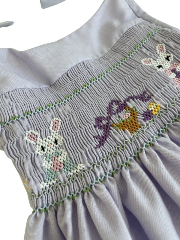 Vestido confeccionado en Oxford color lila, con tirantes ajustables que se amarran en delicados moños. Completamente forrado y bordado a mano con conejitos y canasta central.