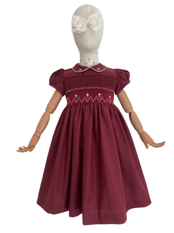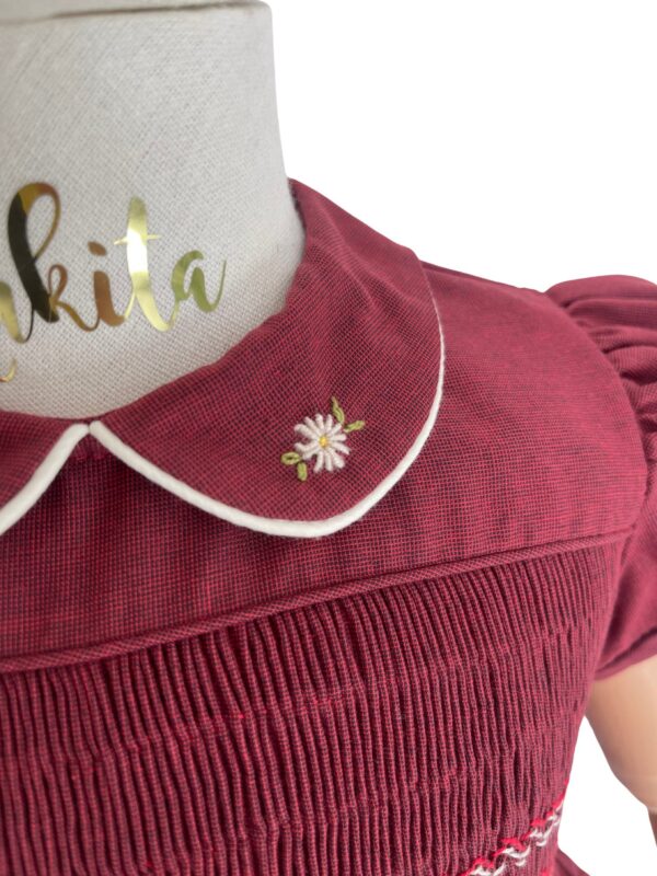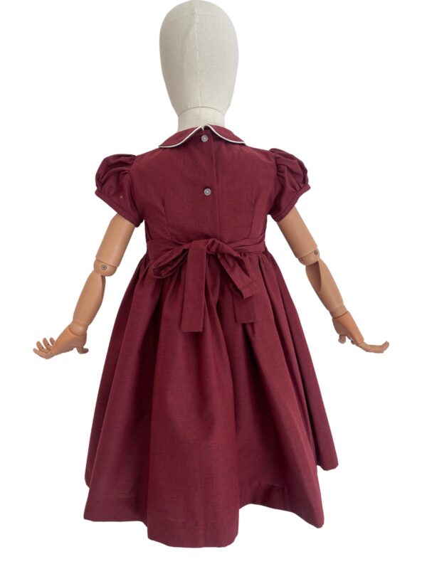 El modelo Margaret vino es una pieza única, confeccionada en tela oxford de tono vino intenso, ideal para lucir en eventos especiales de temporada. Su diseño incorpora delicados detalles en color hueso que enmarcan sutilmente la silueta y resaltan el contraste de forma elegante.