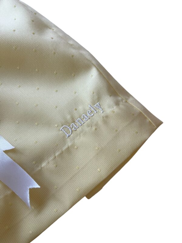 Vestido: Hecho con tela de piqué lumiere amarillo, bordado a mano, botones traseros y cintas de la misma tela para ajustar. ¡Es perfecto para ocasiones casuales y de fiesta!