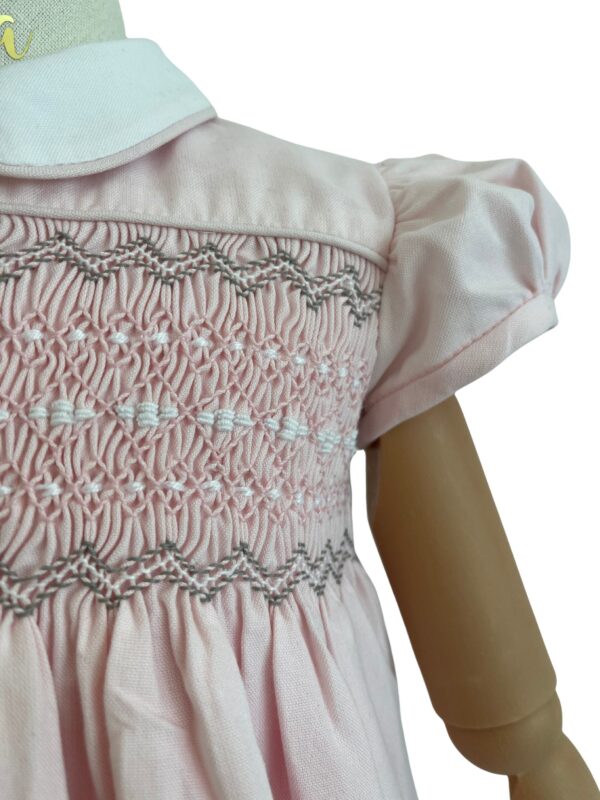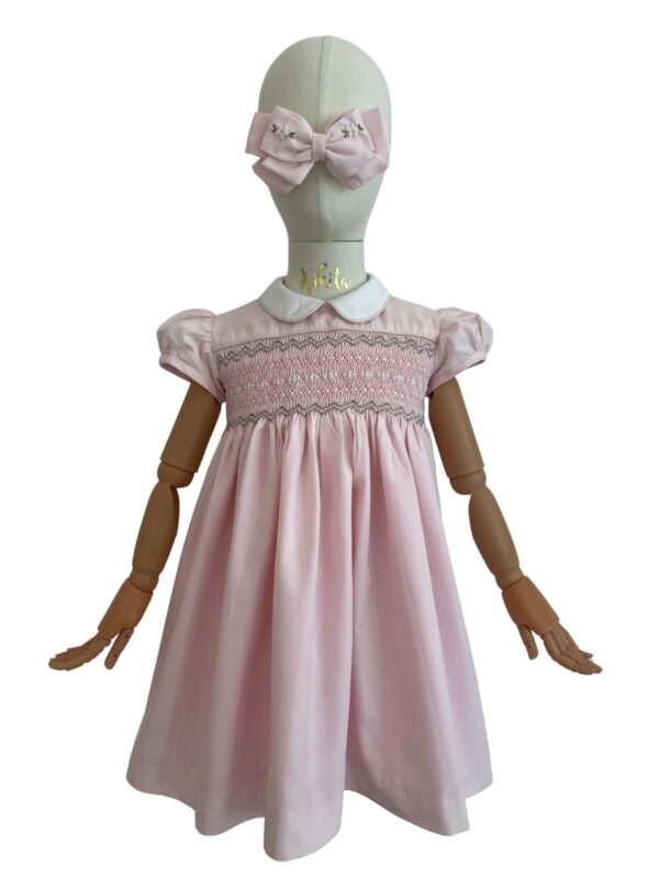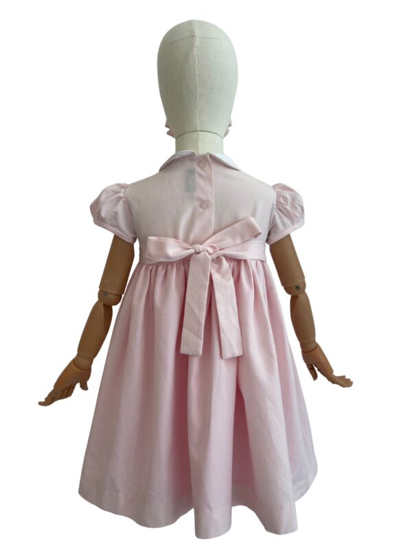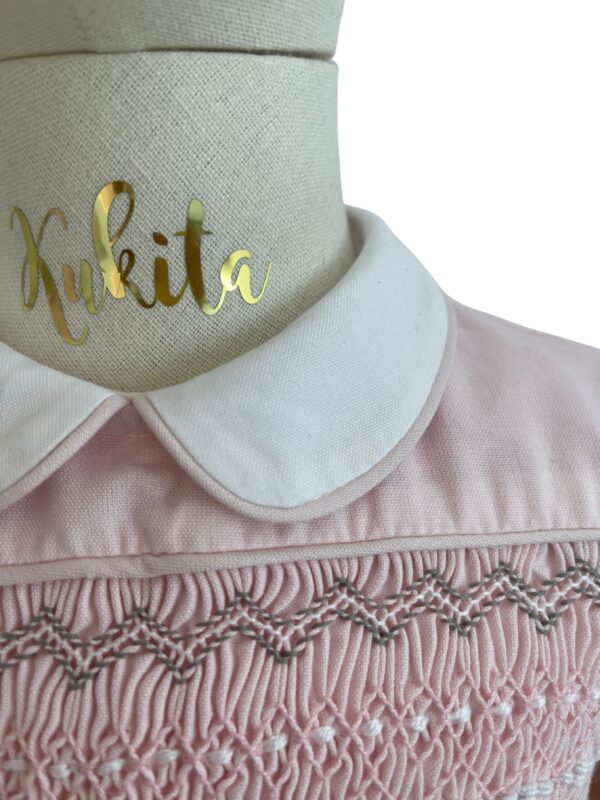 El Vestido Rania rosa claro está confeccionado en tela oxford en un tono rosa suave y luminoso, pensado para resaltar la delicadeza del diseño. Su bordado en color blanco con finos acentos grises aporta un equilibrio elegante y atemporal, ideal para ocasiones especiales. El cuello en color blanco enmarca la prenda con un aire clásico y refinado. Cuenta con botones traseros y cintas para ajustar, lo que permite un mejor calce y mayor comodidad. Su forro interior brinda cuerpo al vestido, mejora la caída y ofrece una sensación agradable al uso. Es una prenda diseñada para acompañar momentos importantes con sencillez, cuidado y buen gusto.